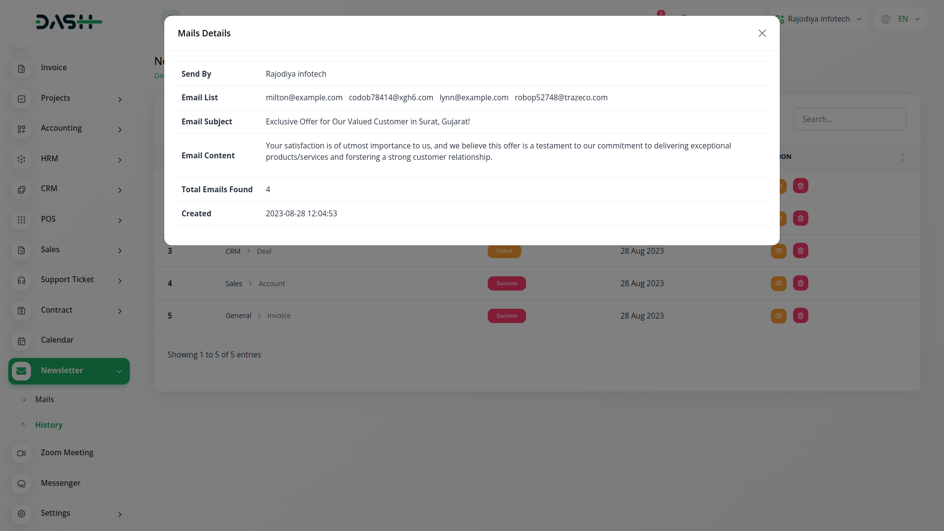 Newsletters provide a history of email statuses, allowing you to see if emails were successfully sent or if there were any issues.Using the history of the newsletter, you can also see how many people have sent the mails and to which time.