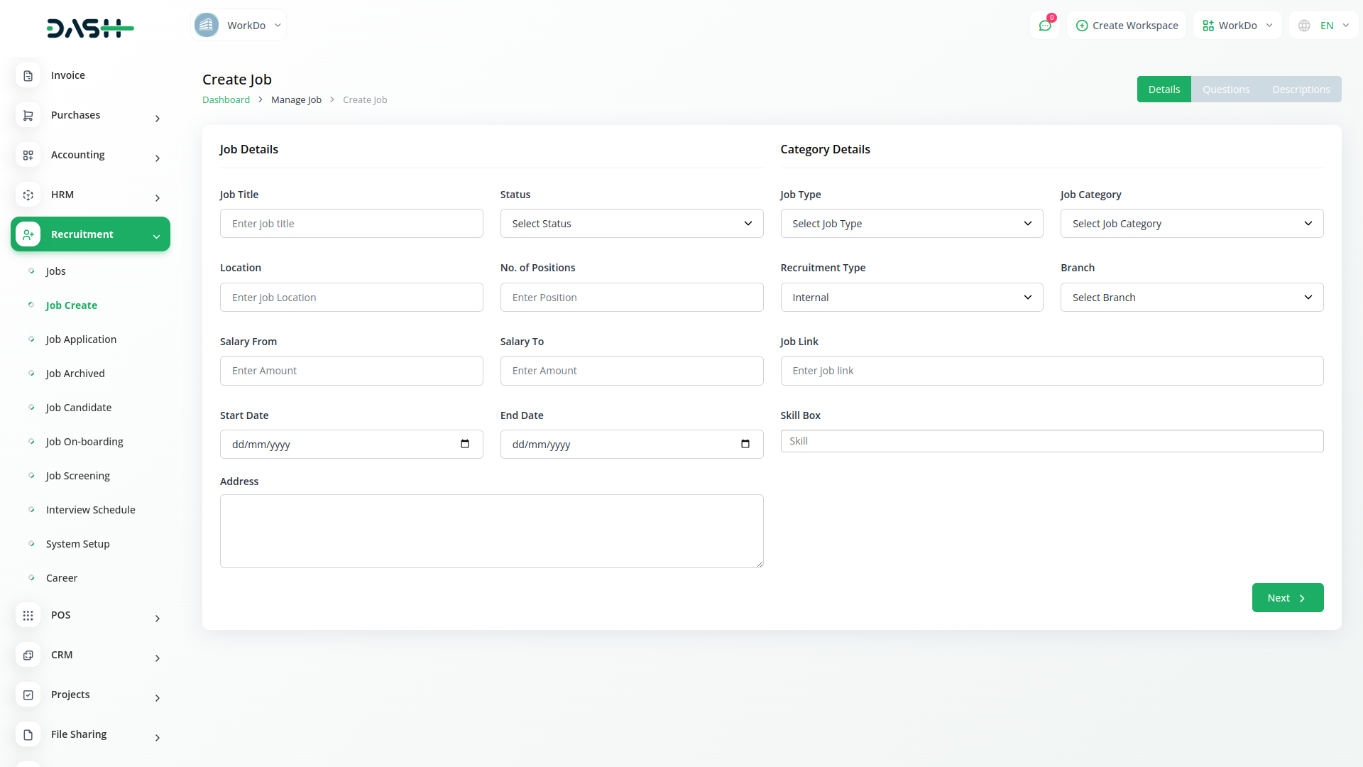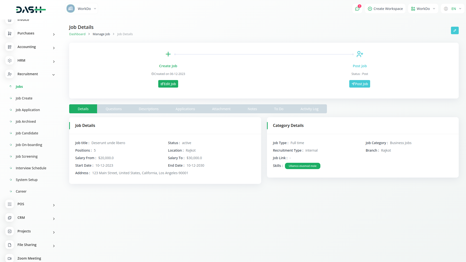 Within the recruitment module, the Jobs Creation page offers a streamlined process for creating new job listings. Users can input essential details including job titles, descriptions, requirements, and any other pertinent information. This intuitive interface allows for the customization of each listing to attract the right candidates. By simplifying the task of posting job openings, users can quickly reach potential candidates while maintaining consistency and professionalism in their job postings.