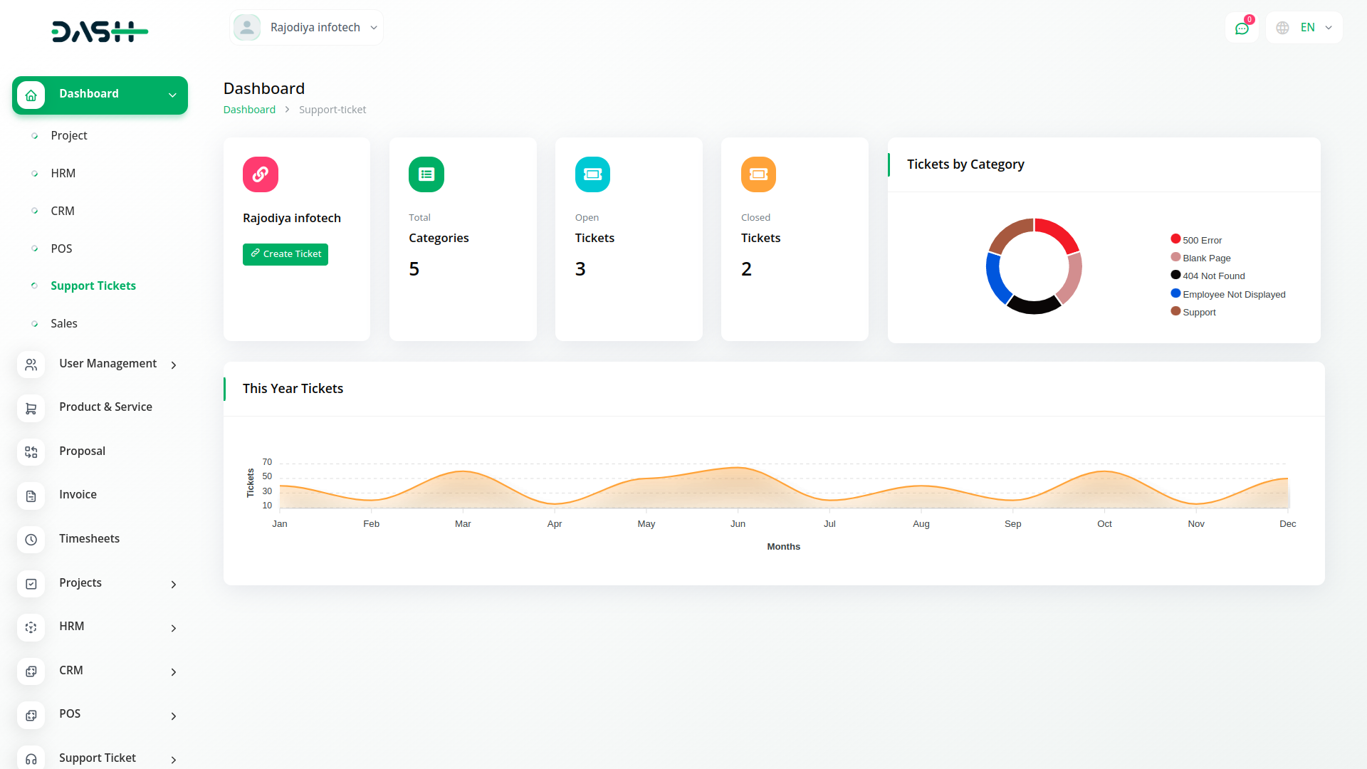 Get easy access to open and closed ticket statistics. A visual presentation of categories and a monthly generated ticket chart are presented.