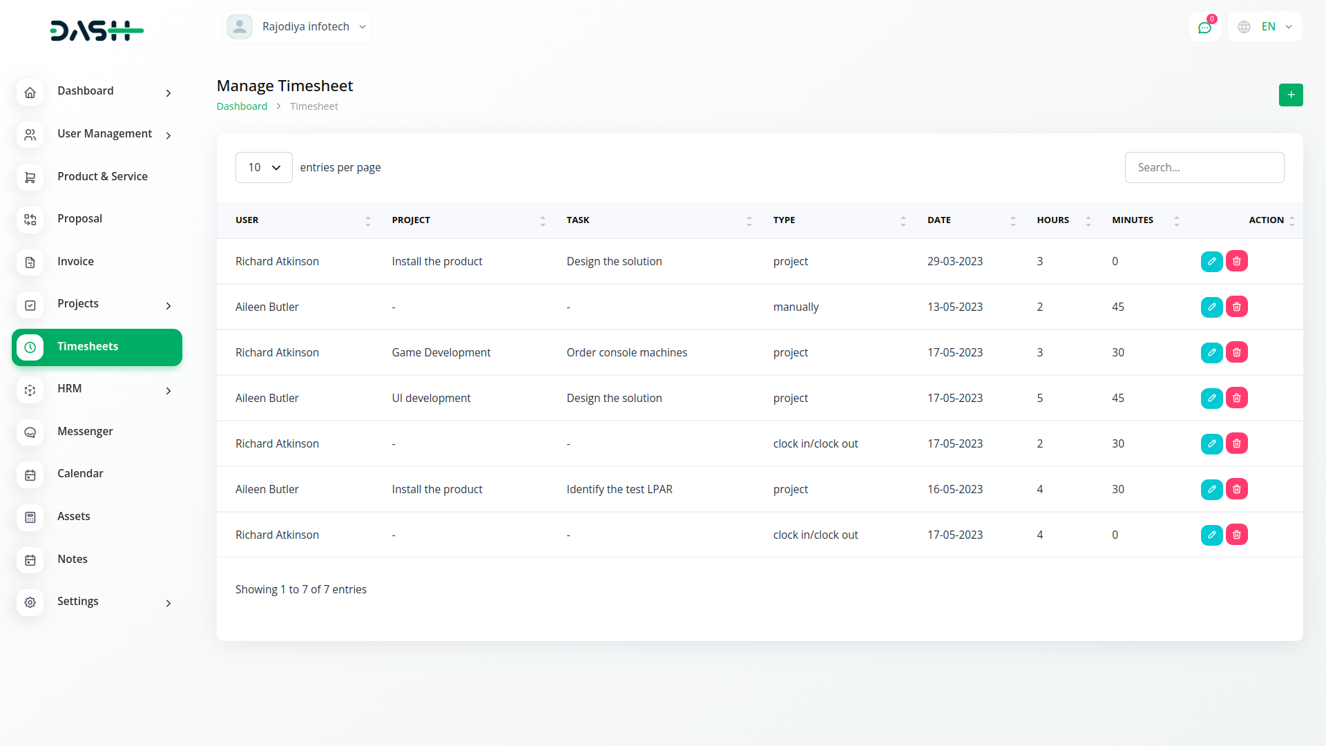 Create a timesheet by assigning Projects, Tasks, and Users. Assign a starting and ending date as well as a time. This allows you to manage your project most efficiently.