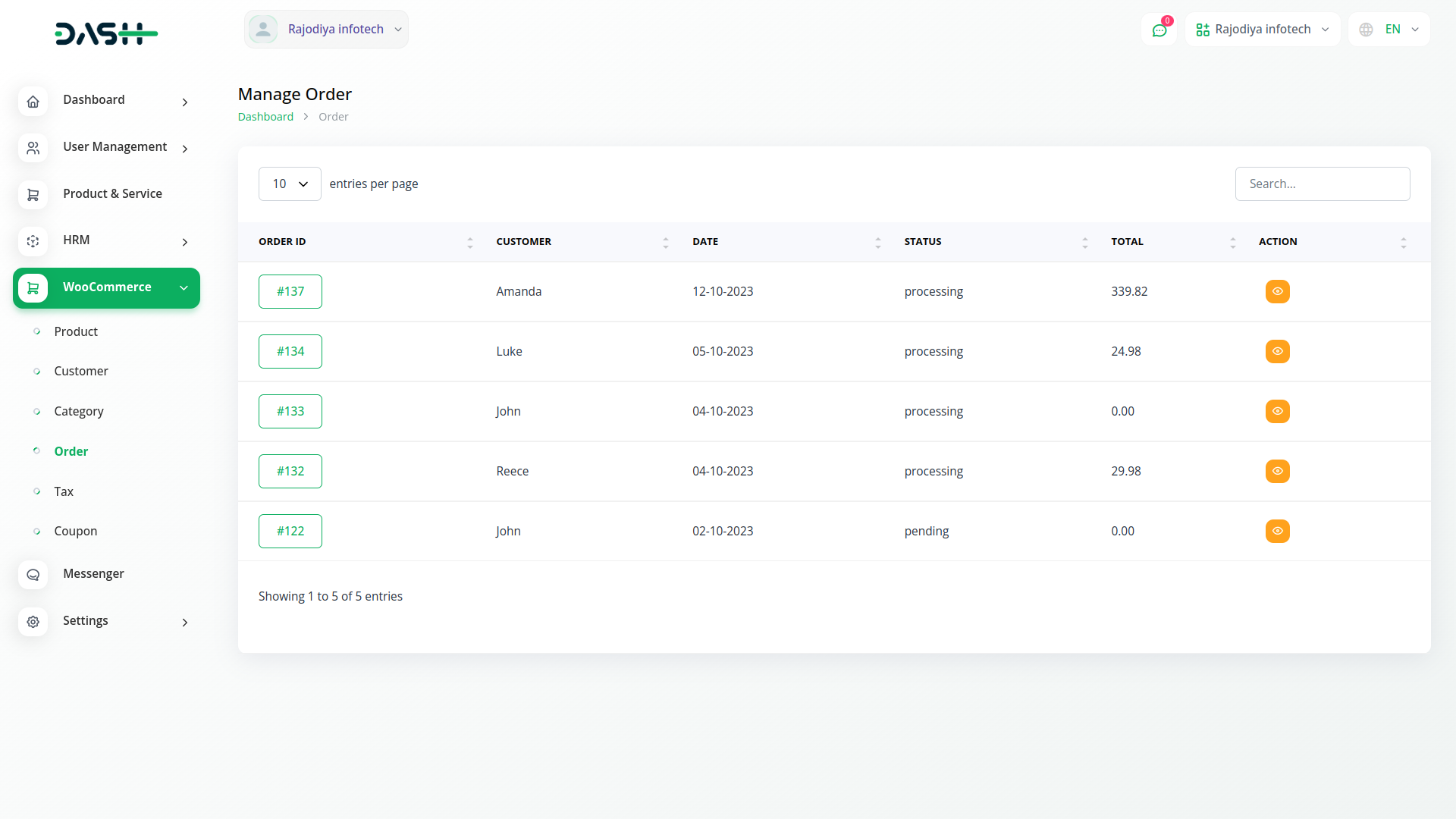 Integrate and manage your store`s products and inventory with WooCommerce using WooCommerce. Simplify product and coupon management while enhancing customer interactions for an optimized WooCommerce experience.You can also add your woocommerce products to dash saas by clicking on the button given beside the product.
